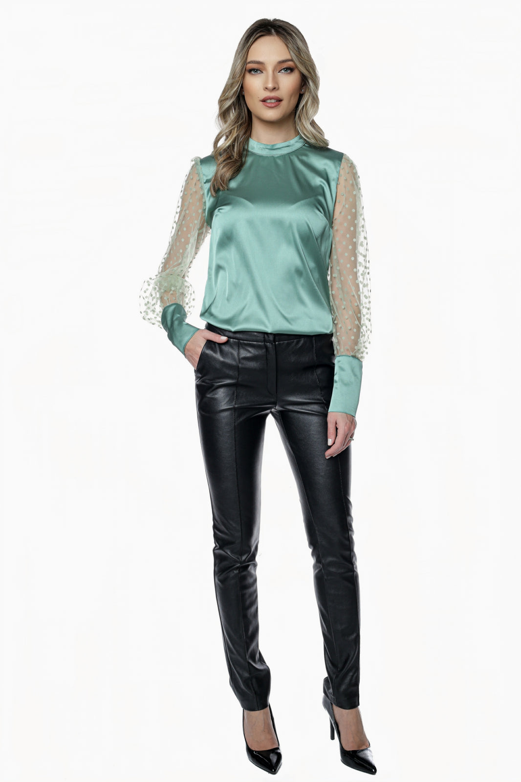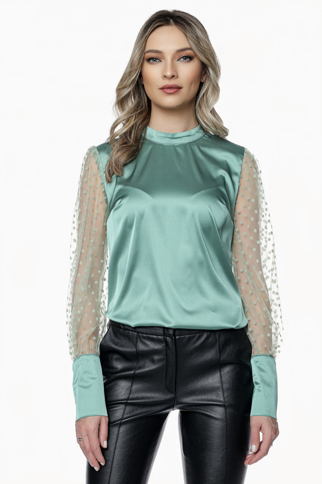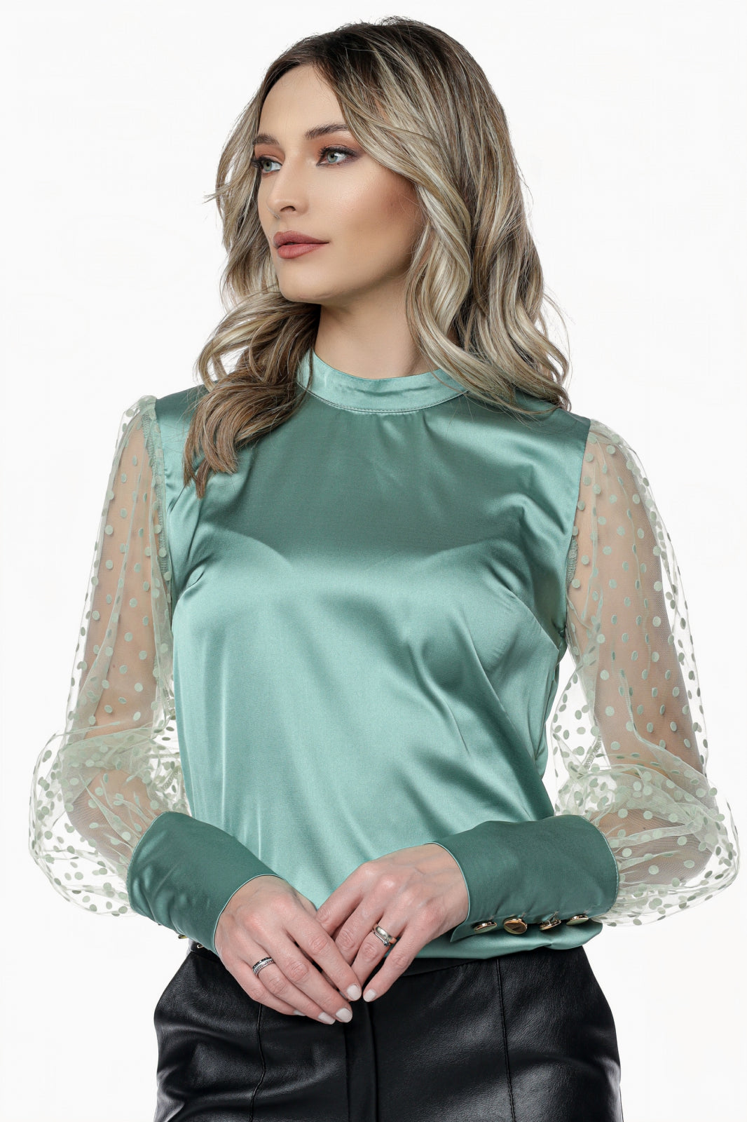 Bluza MBG olive din satin cu maneci din tull cu buline