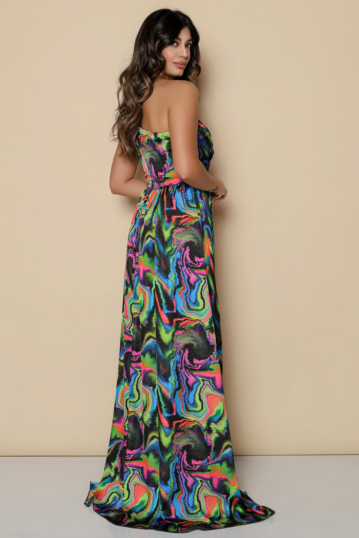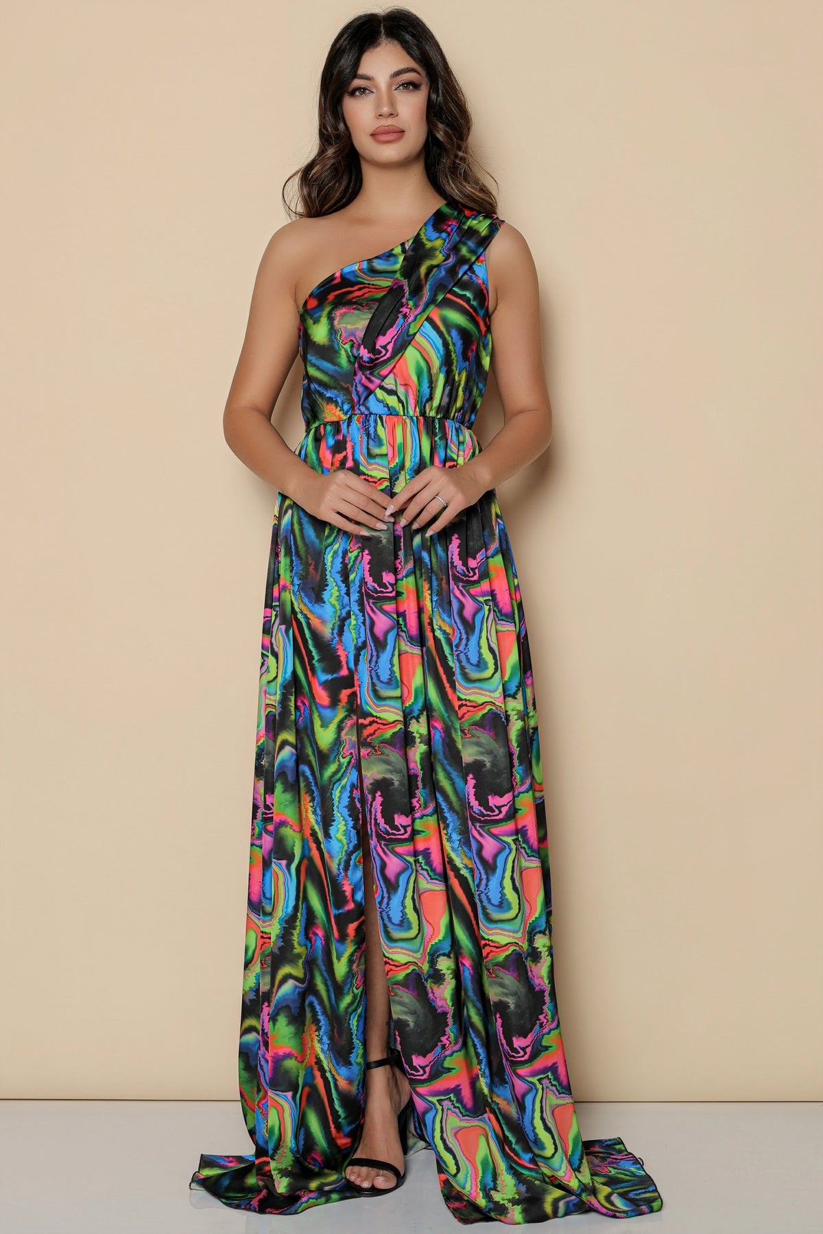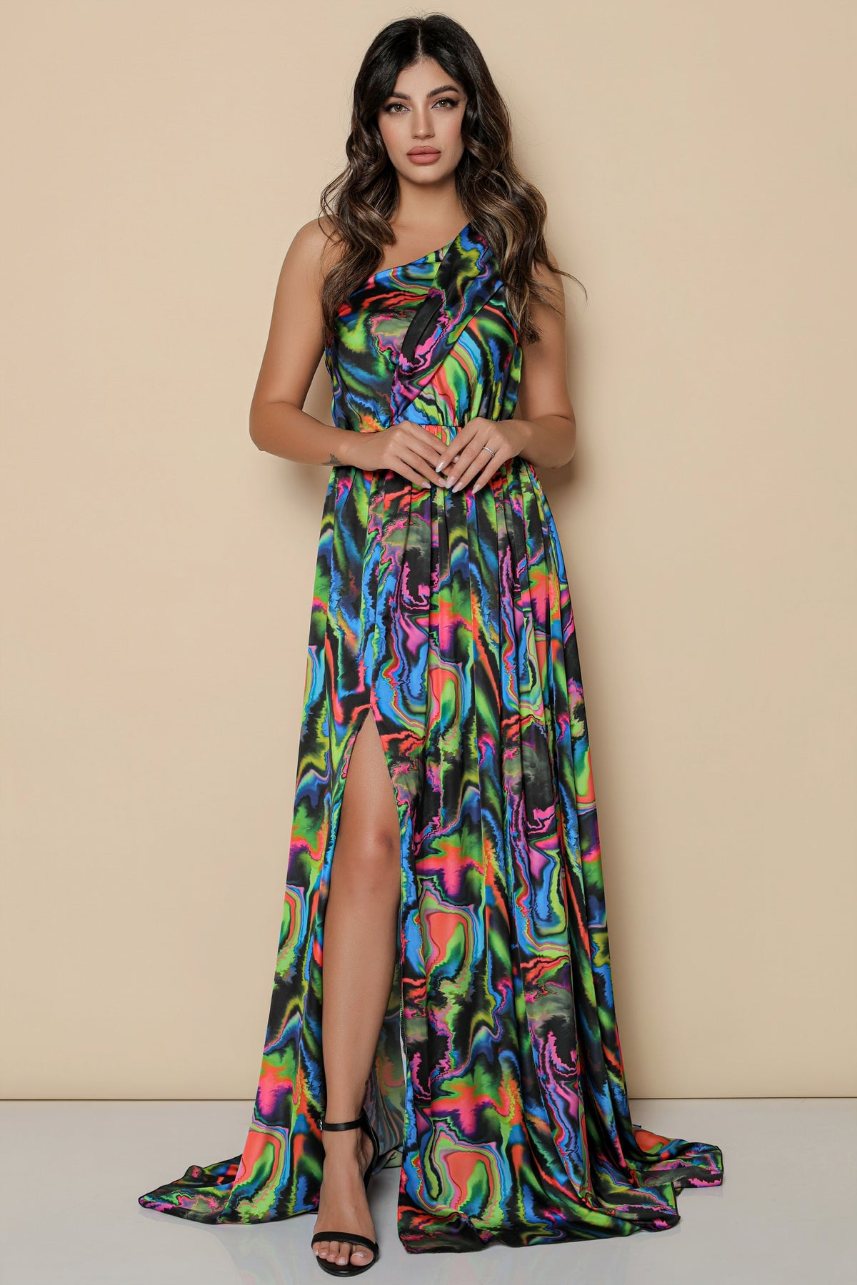 Rochie lunga MBG pe umar cu imprimeu multicolor