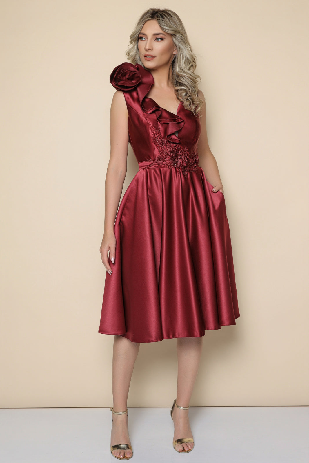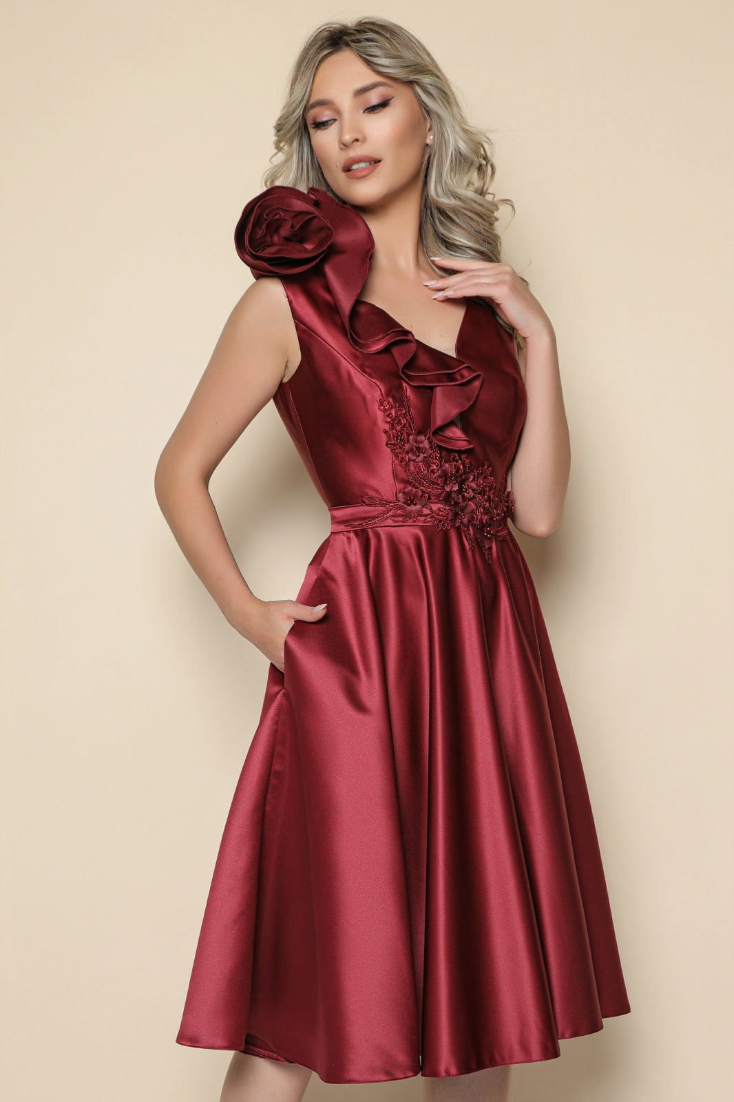 Rochie MBG bordo cu floare stilizata pe umar si broderie