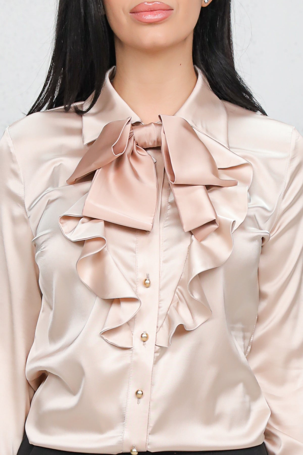Bluză elegantă realizată din material satinat, cu croială feminină și detalii sofisticate. Modelul este evidențiat de volane frontale delicate și o fundă decorativă contrastantă la guler, care adaugă un aer rafinat și modern.
