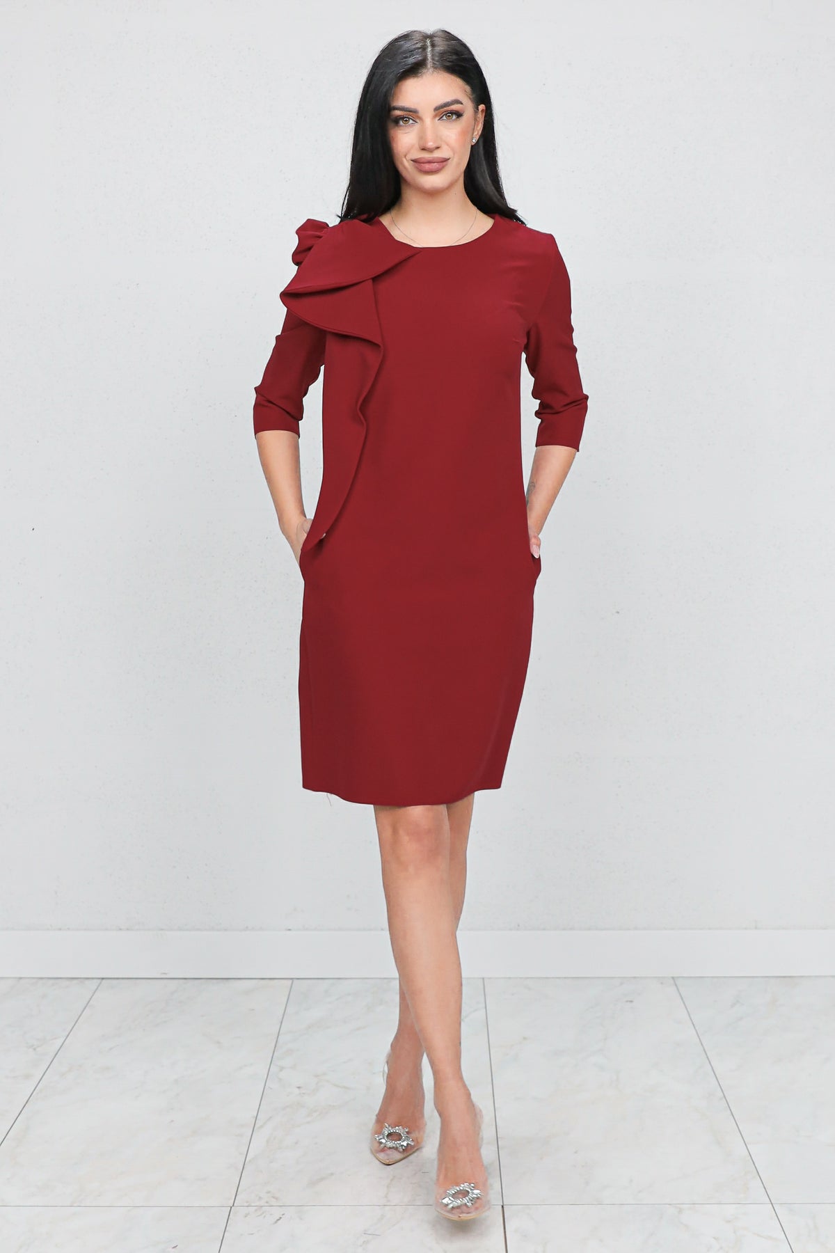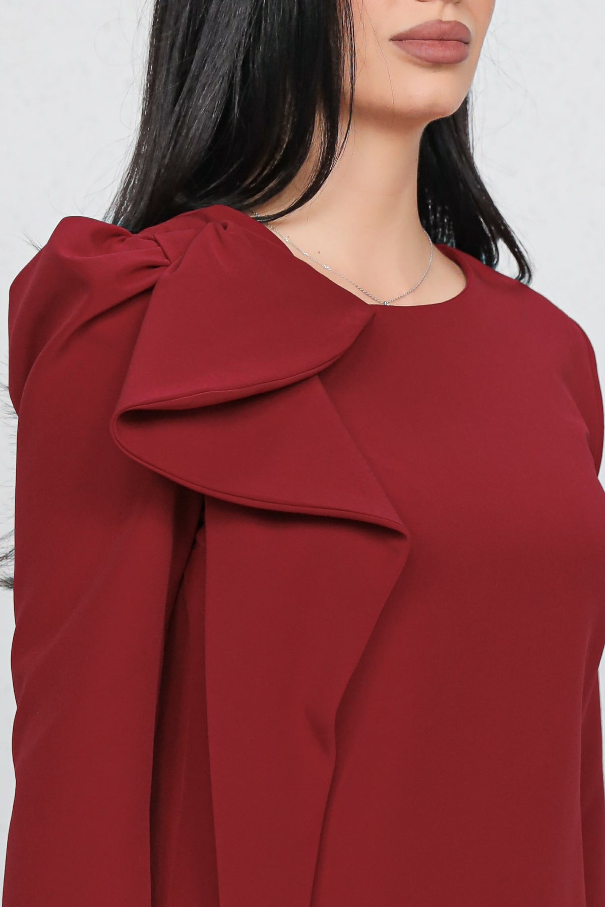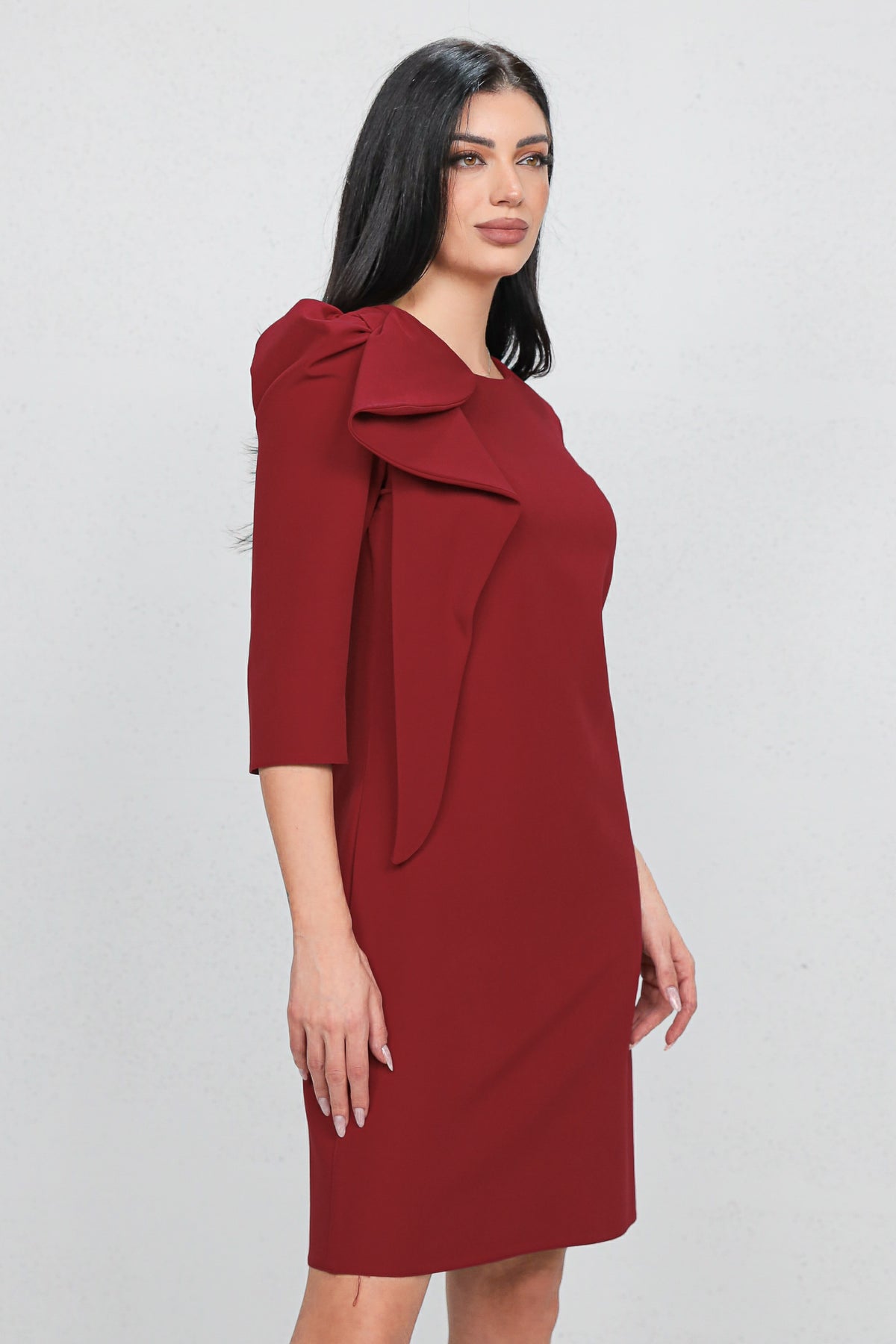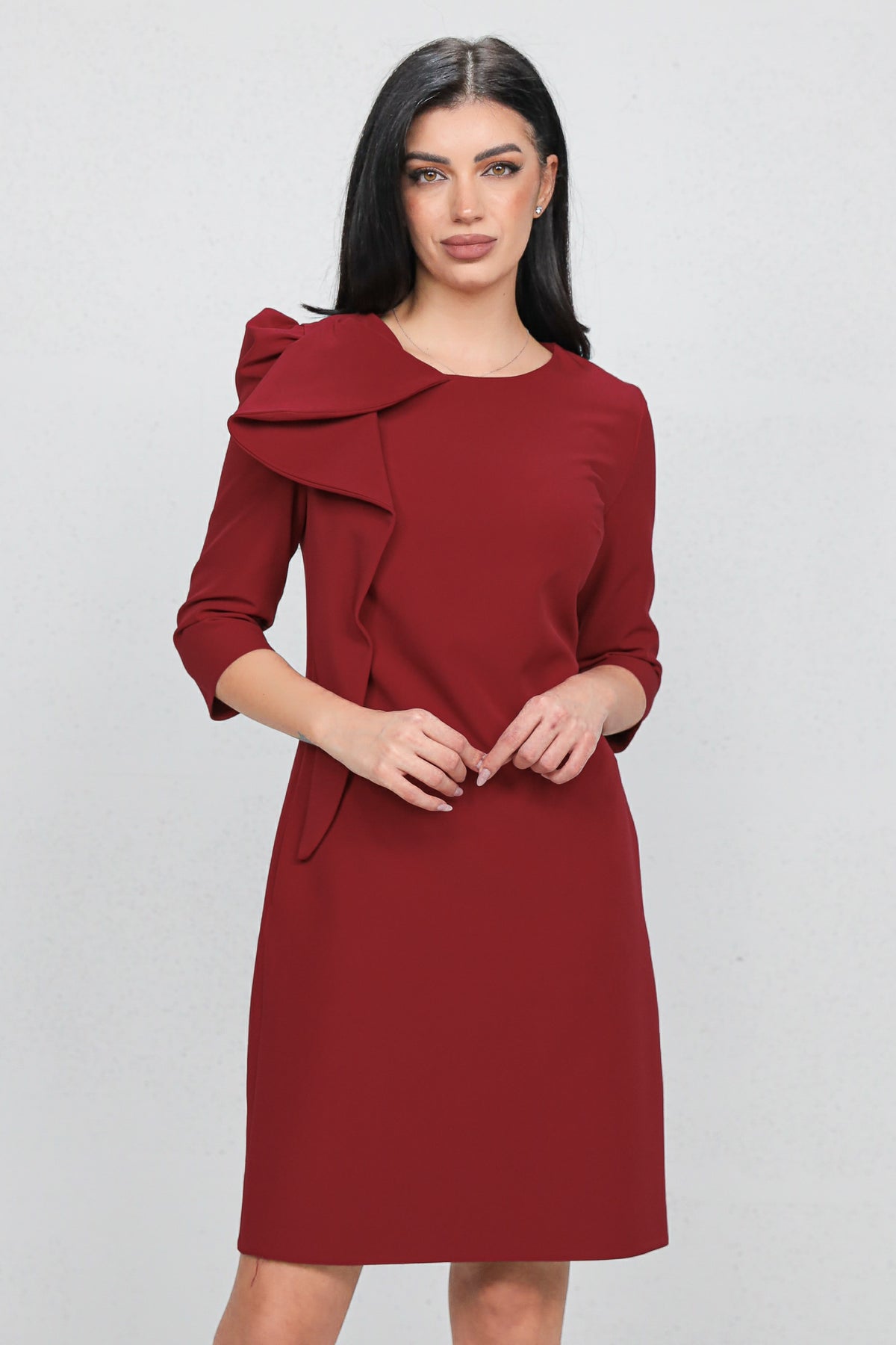 Rochie feminină cu design statement, evidențiată de funda decorativă pe umăr, ce adaugă un accent rafinat și modern. Croiala midi dreaptă avantajează silueta, iar materialul cu ținută oferă un aspect elegant, potrivit pentru evenimente, petreceri sau ocazii speciale. O piesă care atrage privirea fără a fi încărcată.