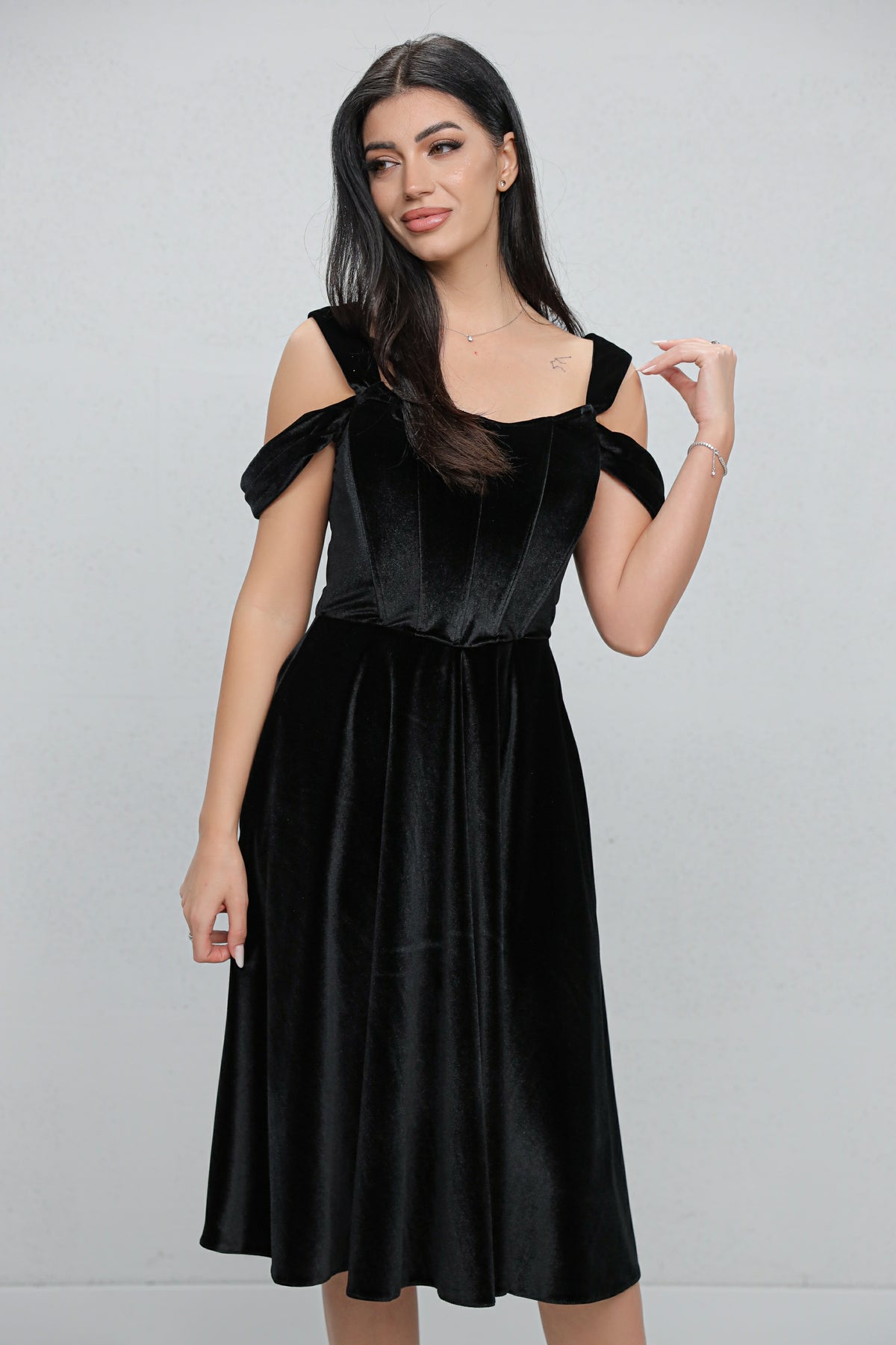 Rochie MBG neagra din catifea cu bust corsetat