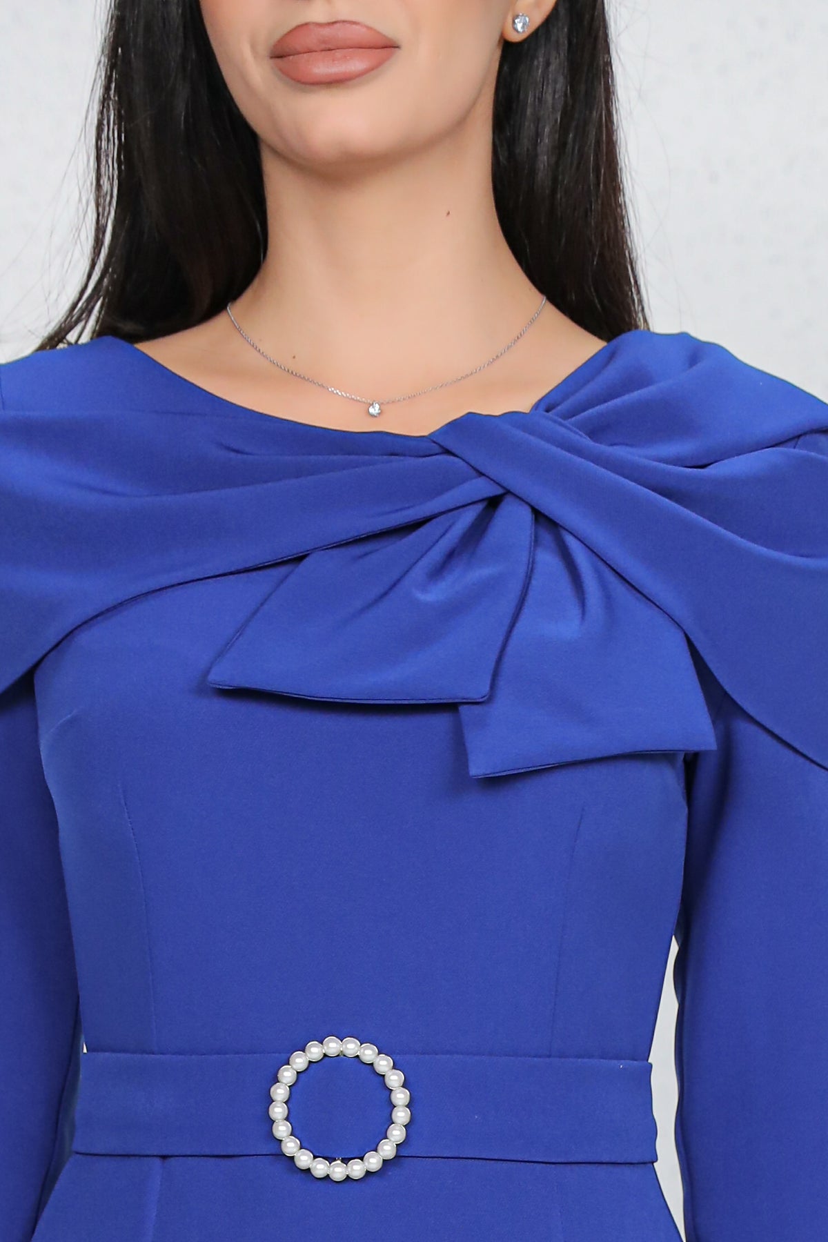 Rochie MBG albastra cu funda stilizata la decolteu si catarama cu perle