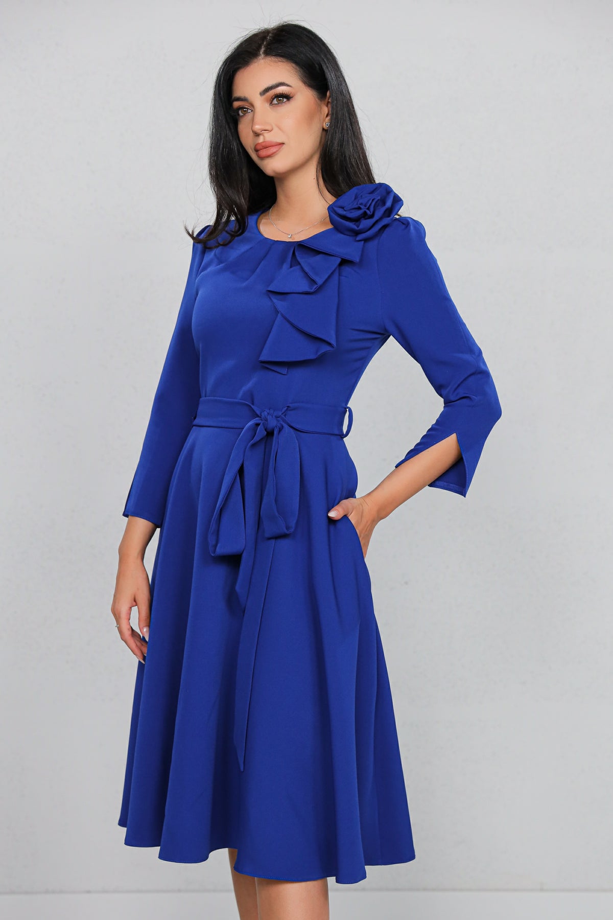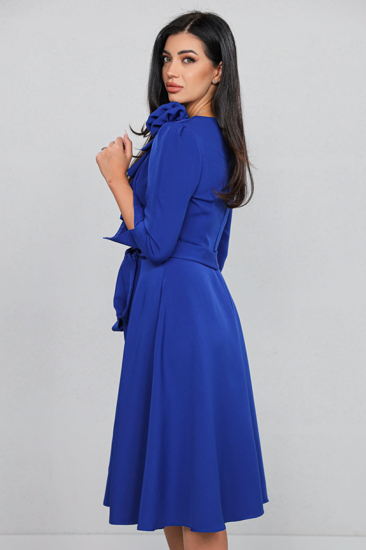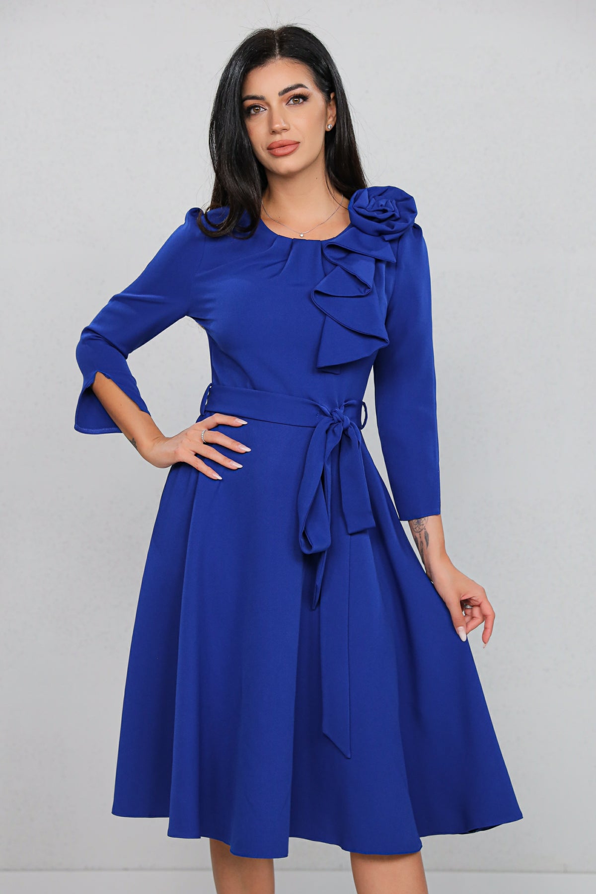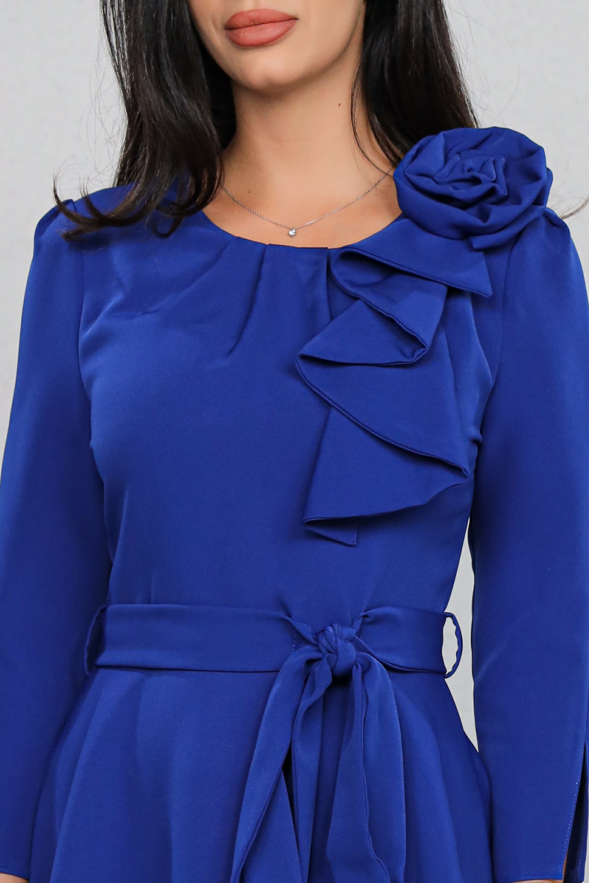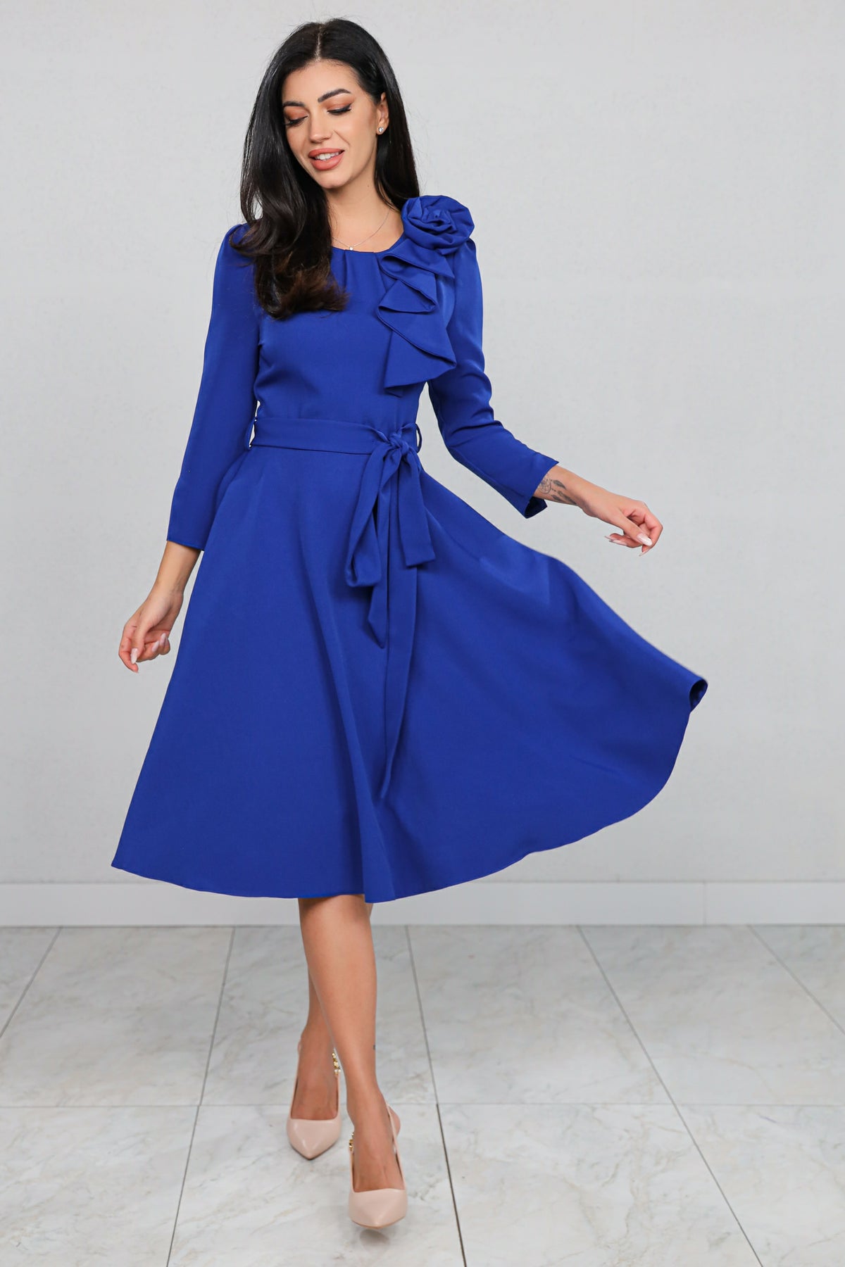 Rochie MBG Albastră cu Volan Aplicat și Cordon în Talie