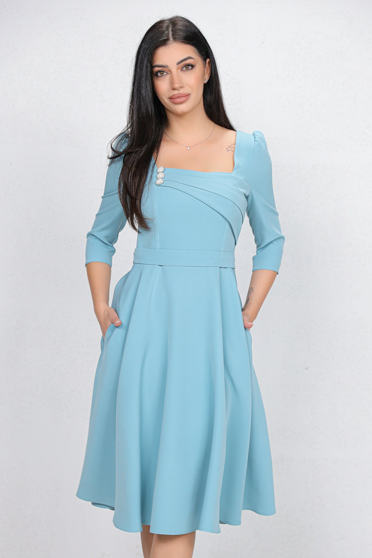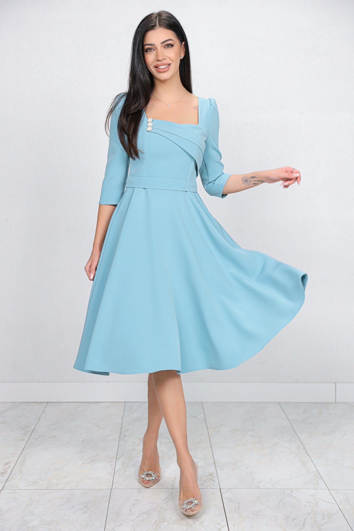 Rochie MBG bleu cu design in zona bustului accesorizat cu nasturi perlute