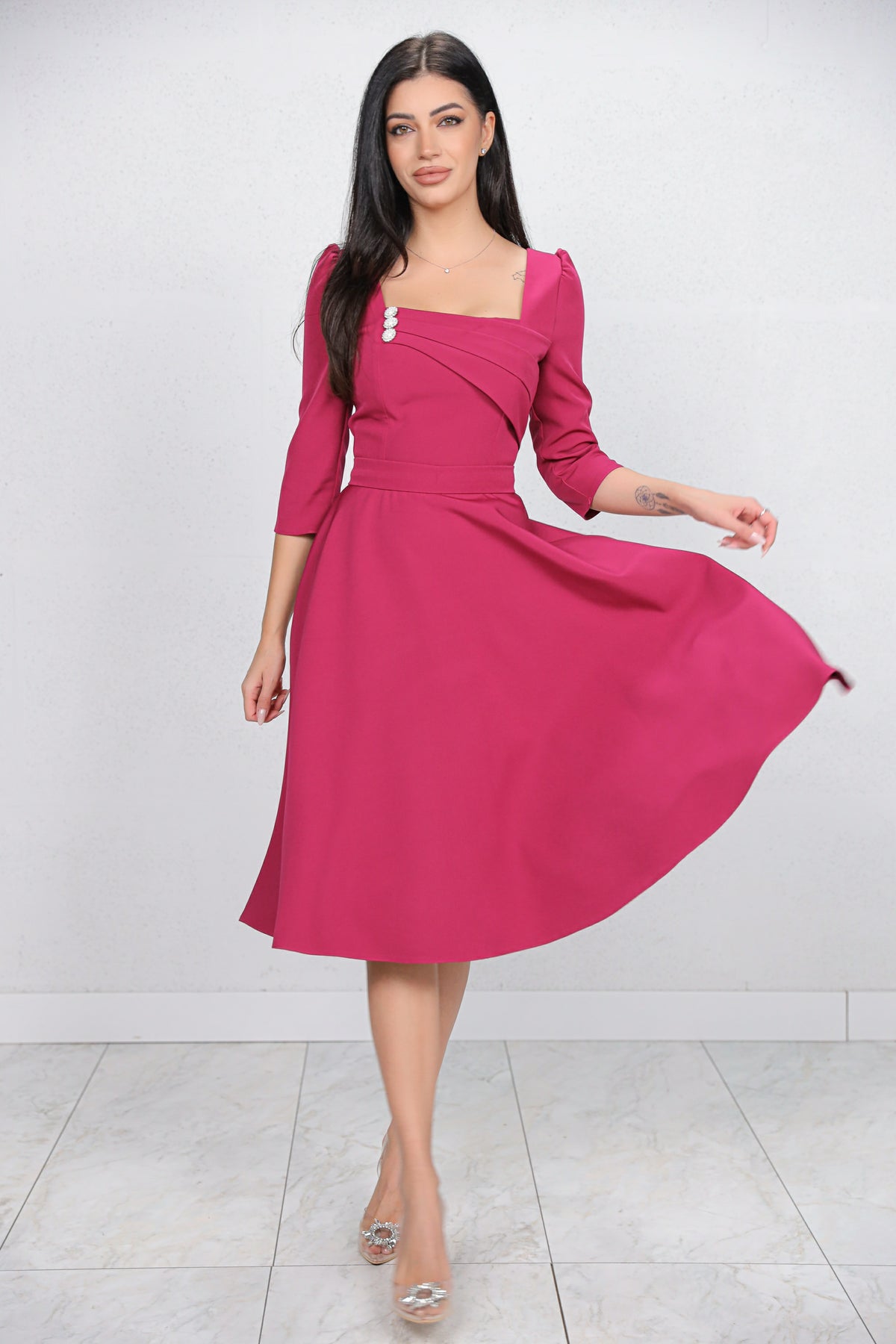 Rochie MBG magenta cu design in zona bustului accesorizat cu nasturi perlute