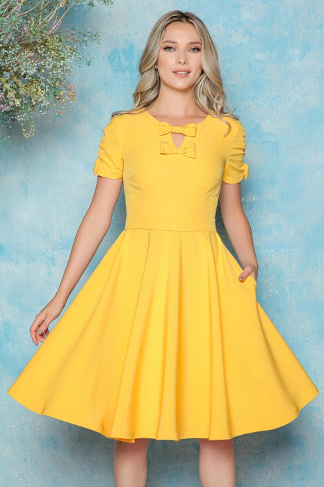 Rochie MBG galbena cu fundite la decolteu si maneci