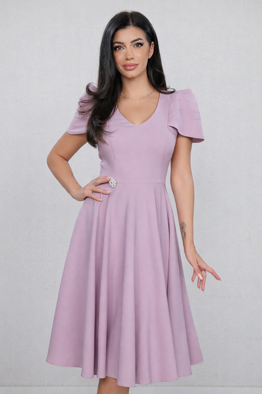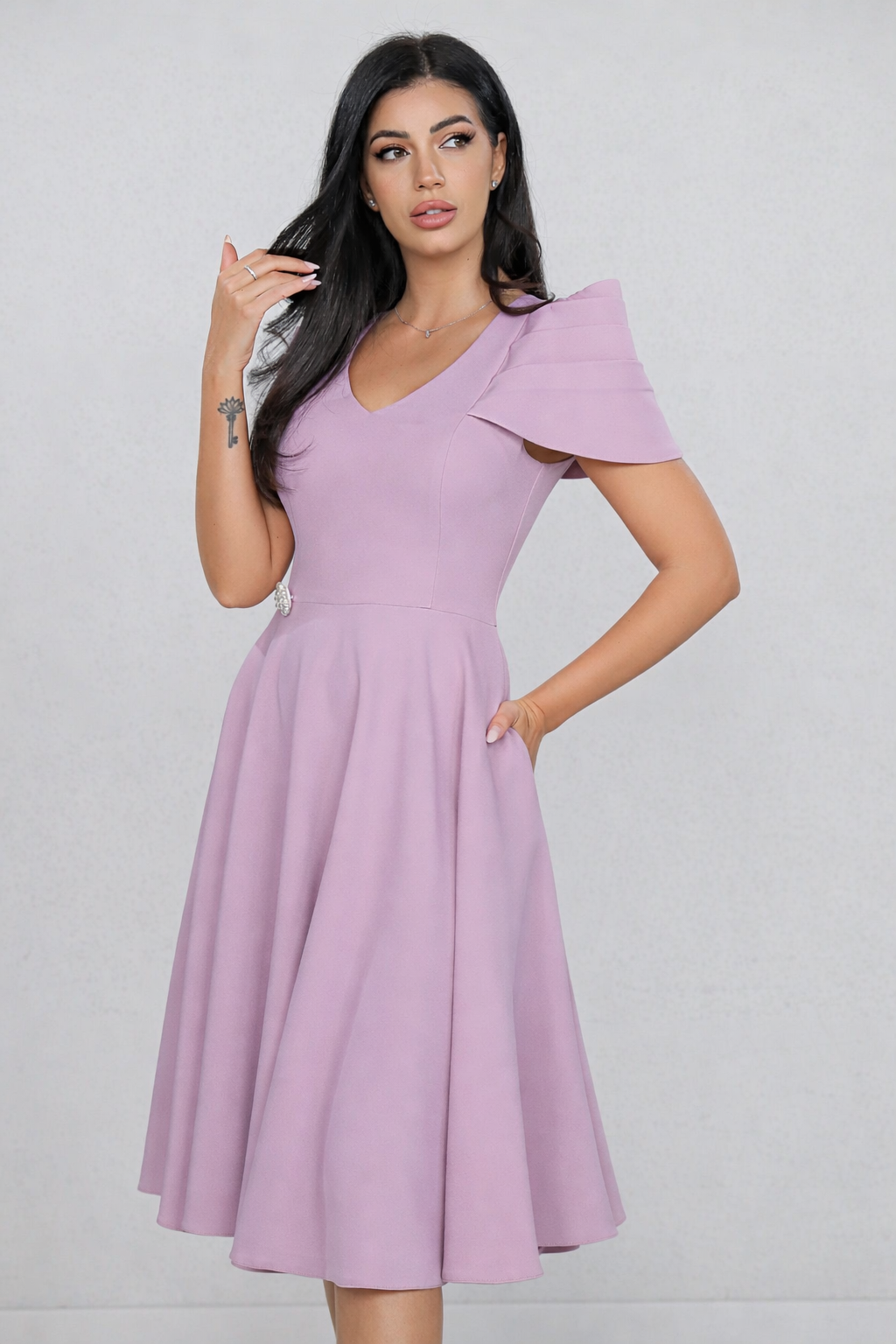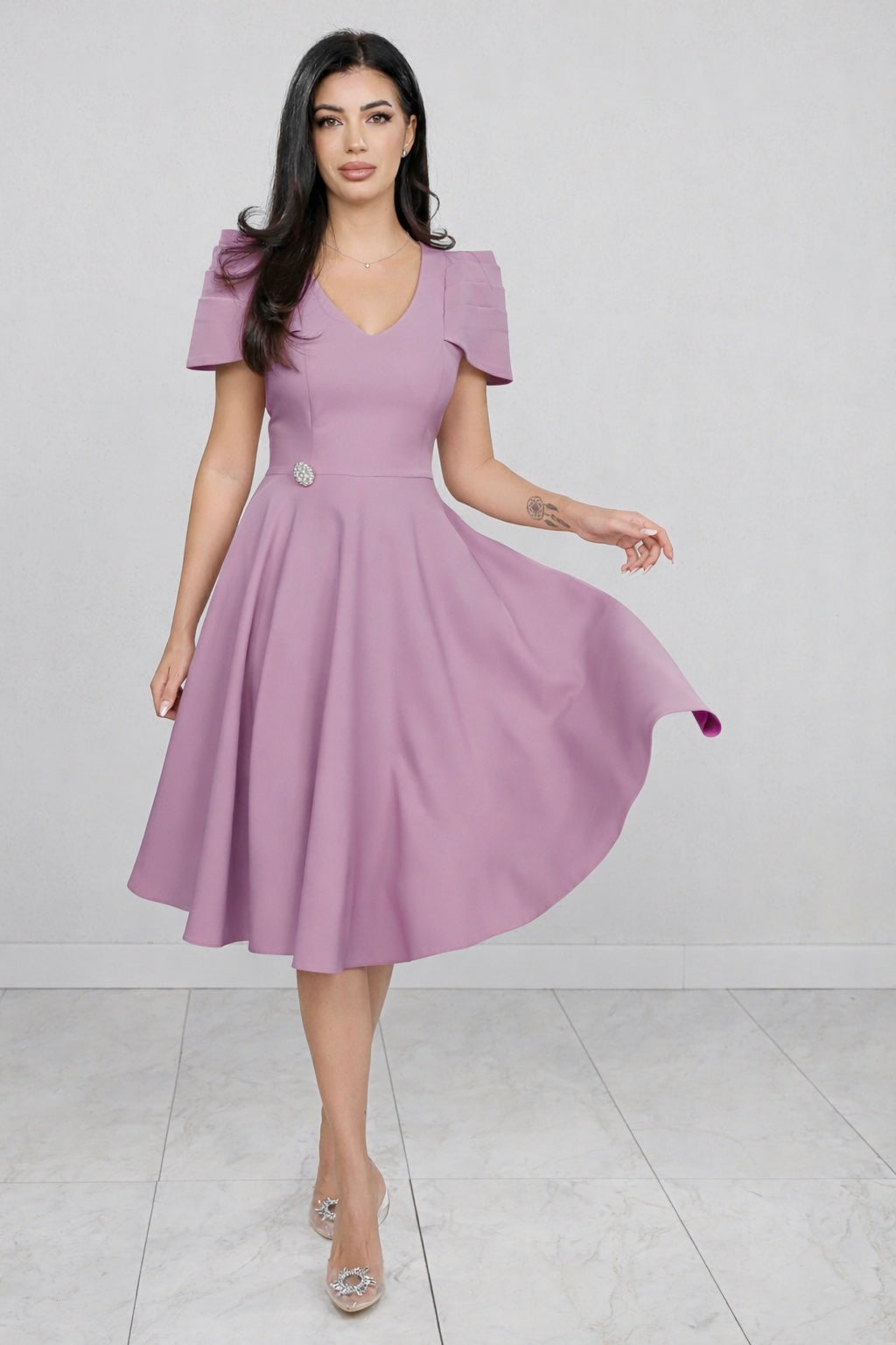 Rochie MBG lila cu maneca din falduri si accesoriu in talie