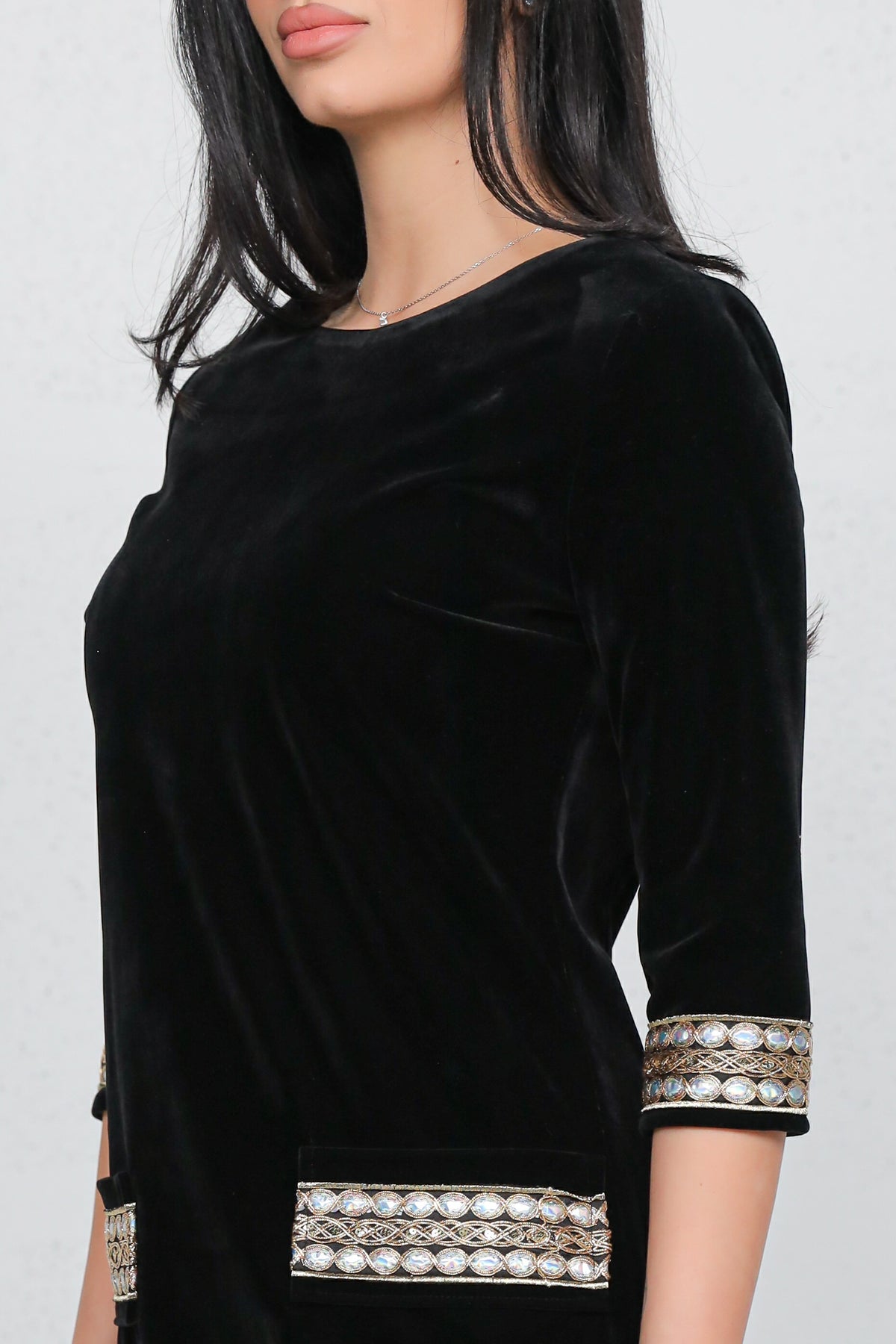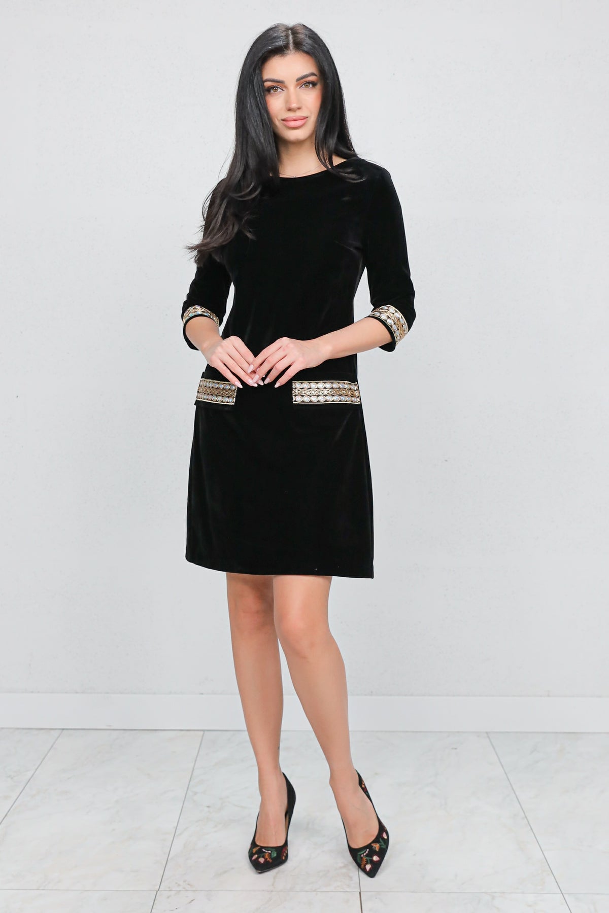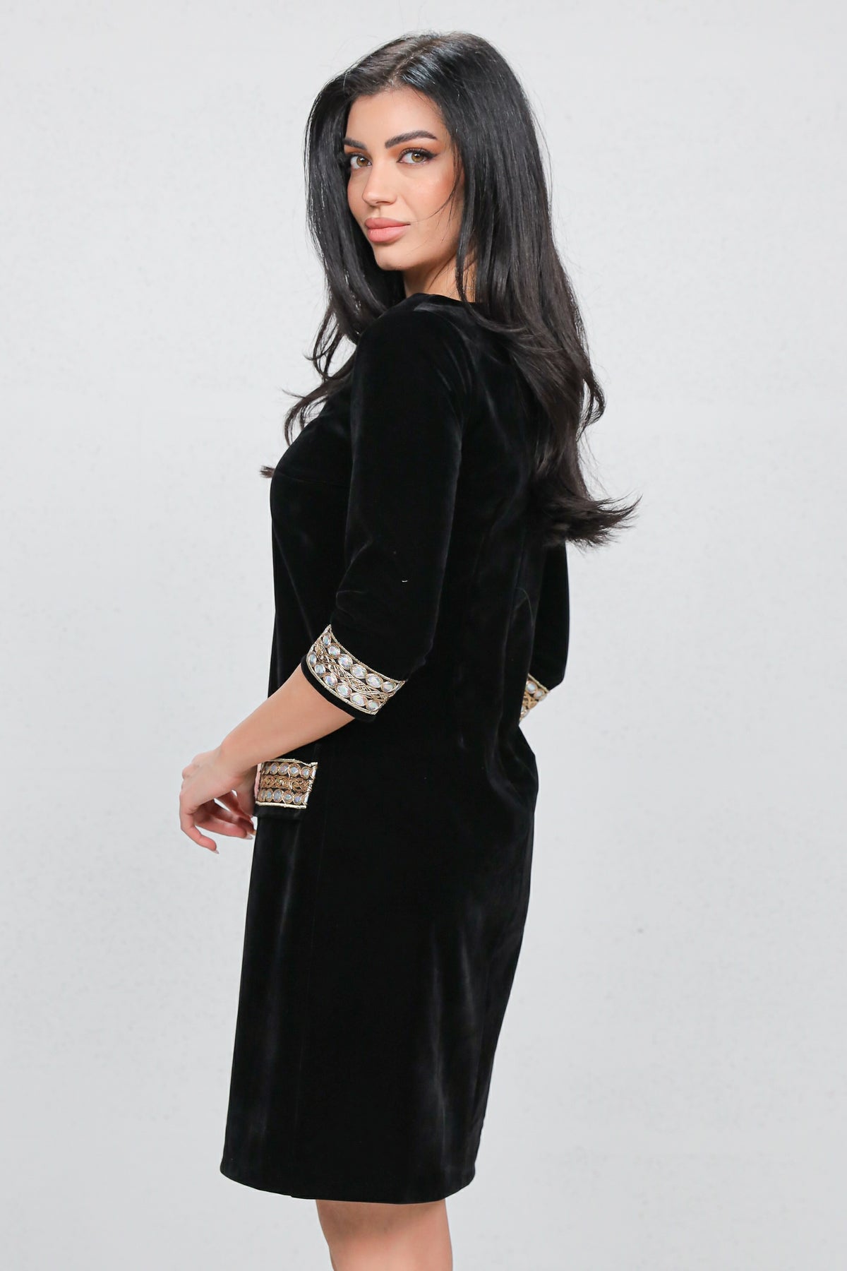 Rochie MBG Neagră Midi din Catifea cu Detalii Decorative Aurii