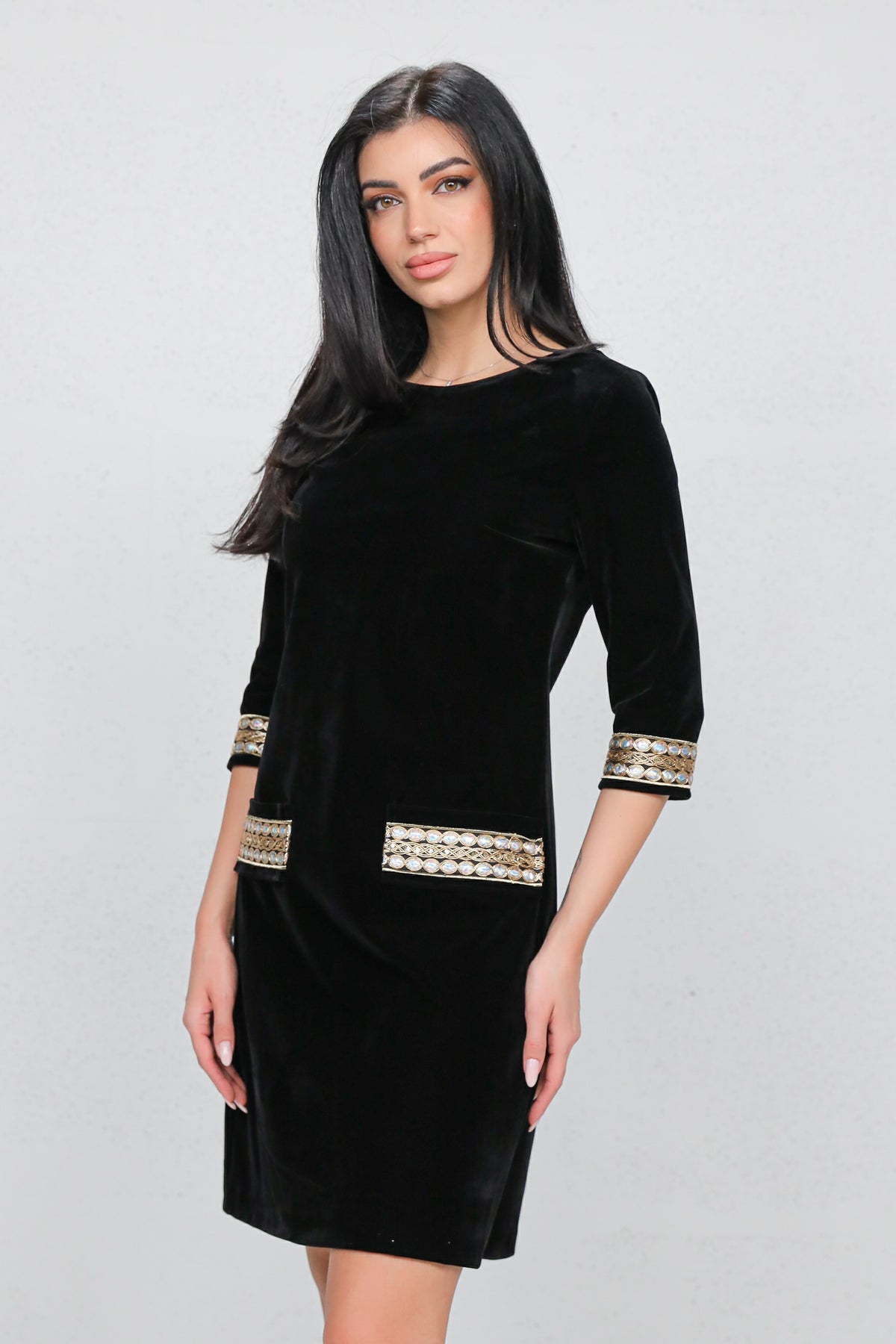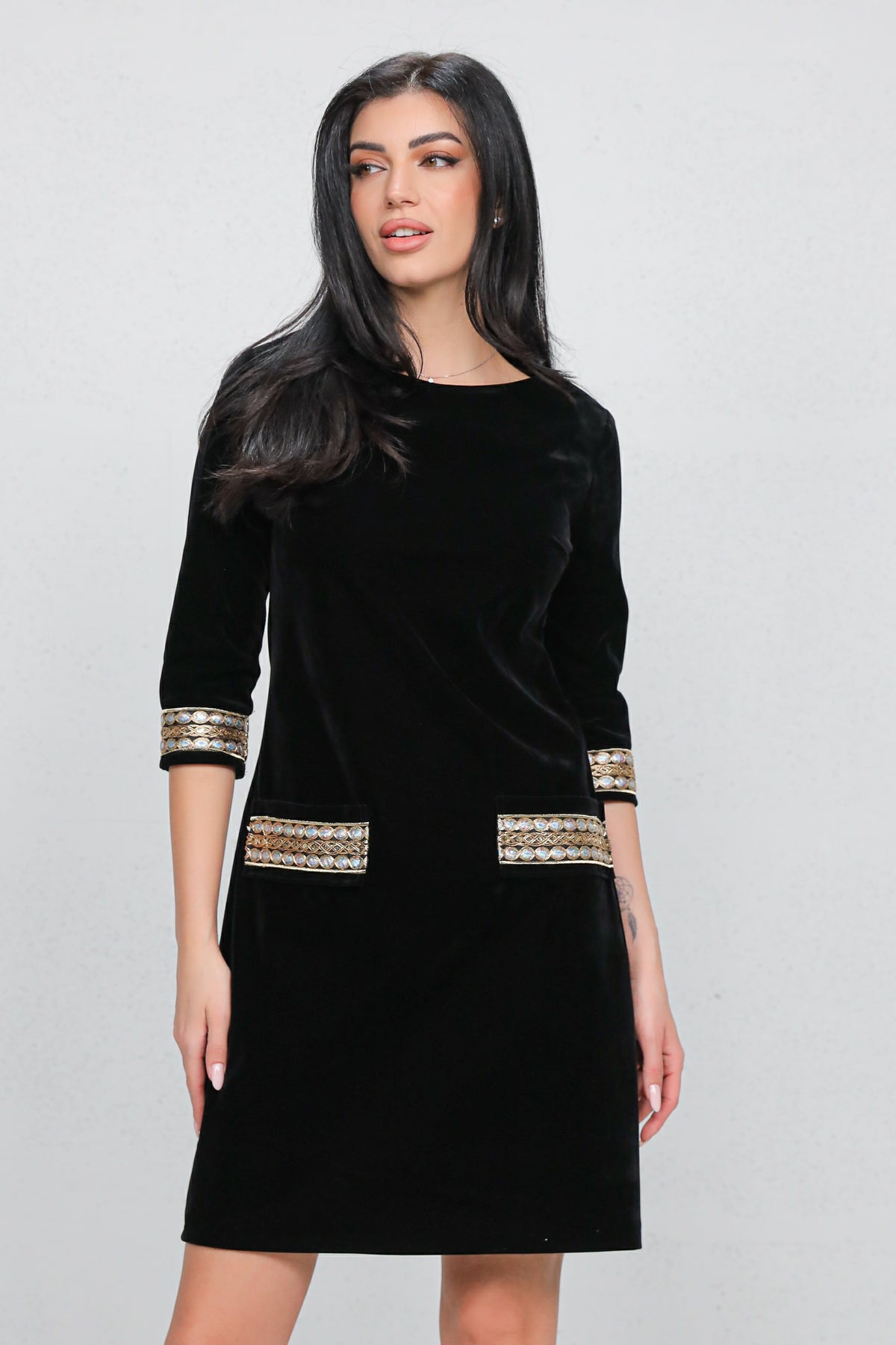 Rochie midi elegantă din catifea fină, într-o nuanță clasică de negru, ideală pentru evenimente speciale sau ocazii de seară. Designul minimalist este pus în valoare de detaliile decorative aurii aplicate la mâneci și în zona taliei, care adaugă un accent sofisticat fără a încărca ținuta. Croiala dreaptă avantajează silueta și oferă un look rafinat, ușor de accesorizat.